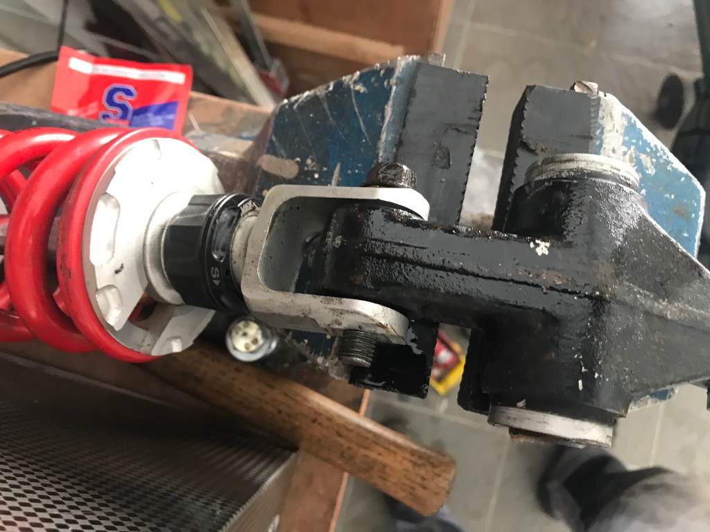 Jetzt hab ich die Backen dick und die Schwinge samt umlenkhebeln raus —— der Bolzen an der unteren Federbeinhalterung geht nicht mehr raus, komplett fest. Und Spiel hat der Kram damit auch.../