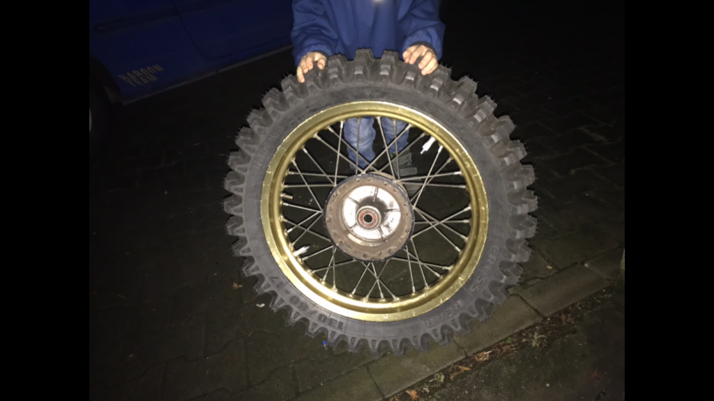 Der Hinterreifen hat keine Zulassung, 130 90 17. Geht bestimmt noch günstiger. Mit Reifenhalter und mit neuer Bremsscheibe.
