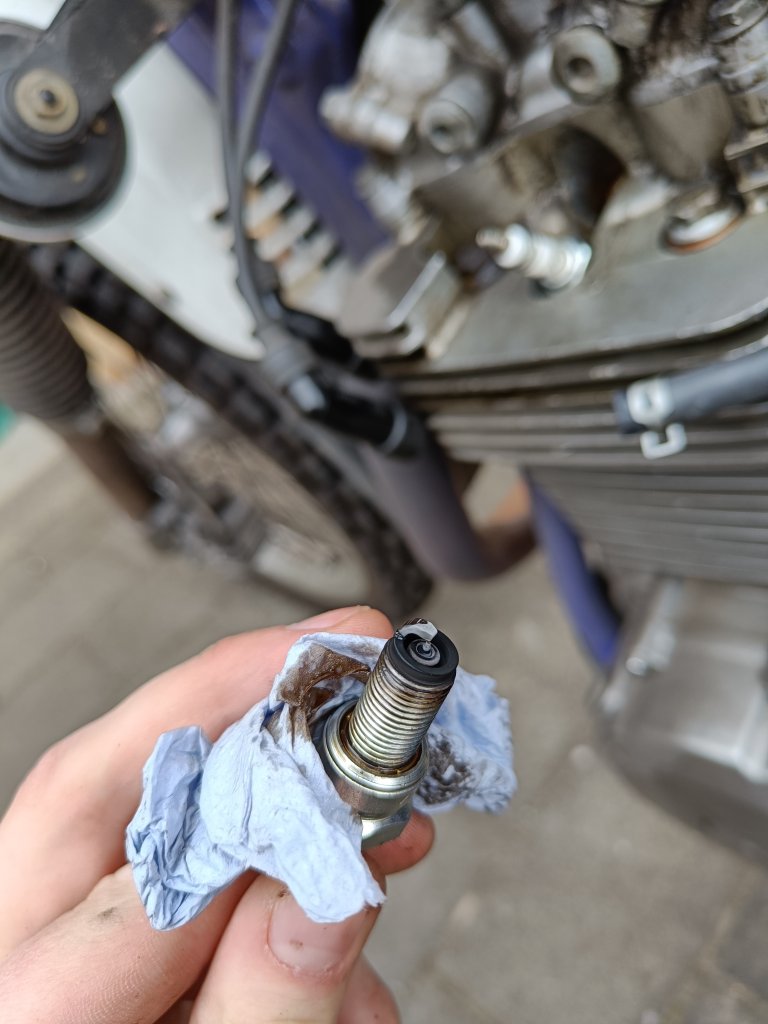So hab ich das bei meiner Dicken auch gemacht, Kerzenbild hatte ich ja letzt hier eingestellt.Claus hat geschrieben: 12 Dez 2019 22:24 Stefan: Motor halbwegs warm fahren (nicht bolzheiß, 3km mit gemäßigtem Tempo reichen völlig). Im Leerlauf tuckern lassen und die Gemischregulierschraube so weit rausdrehen, daß der Motor die schnellste erreichbare Leerlaufdrehzahl hat. Von da etwa 1/8 Umdrehung Richtung fett (also raus). Jetzt die Leerlaufdrehzahl mit der Leerlaufschraube so weit einregulieren, bis der Motor auf den vorschriftsmäßigen 1400 bis 1500/min läuft. Jetzt hast Du eigentlich das optimale Leerlaufgemisch.(was am Tester zu beweisen wäre: soll zwischen 2,5 und 3,5 % CO sein, Hessler sagt: so fett wie geht)