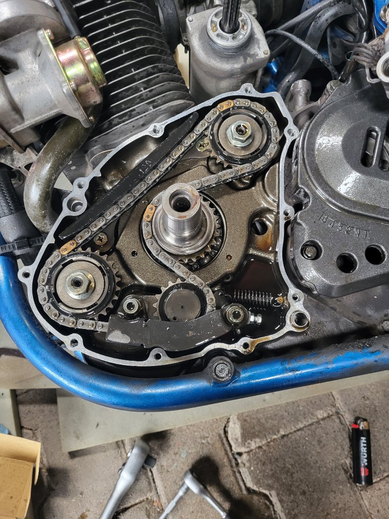 Aha, Keilscheibe abgeschert... Also neue Keilschreibe rein, Kette und AGW Räder ausgerichtet und wieder Zusammengebaut, was gar nicht so einfach ist, wenn man das Anlasserrad und das Polrad nicht voneinander getrennt bekommt... Ich hoffe, dass das Polrad jetzt wieder richtig sitzt, ich wusste ehrlichgesagt nicht, wie ich das Prüfen sollte. Auch wusste ich nicht, wie der Motor zu blockieren ist, also hab ich die Schraube kurzerhand Schlagschrauber Stufe 2 vorsichtig angezogen. Sollten laut Handbuch 150 - 200 Nm gewesen sein (bitte nicht hauen