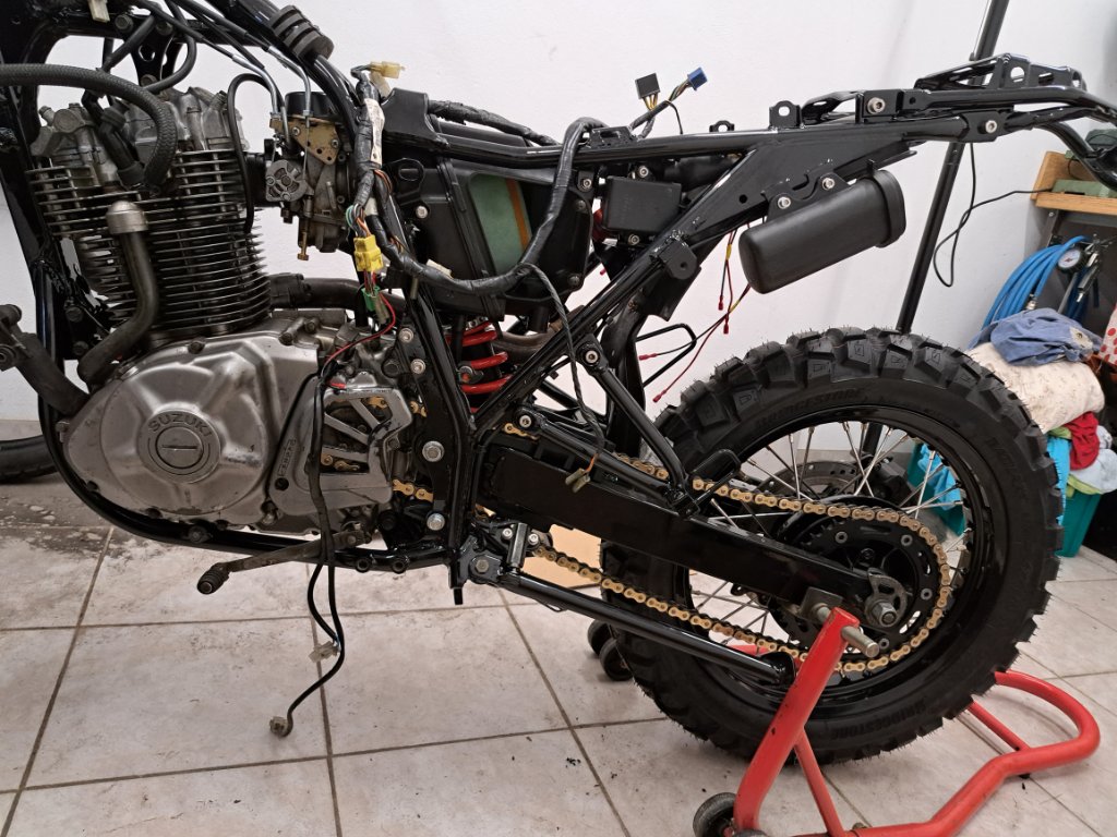 Motor ist jetzt fest mit dem Rahme verschraubt. Vergaser ist drin, neuer Luffi, neue Kette aufgezogen.
