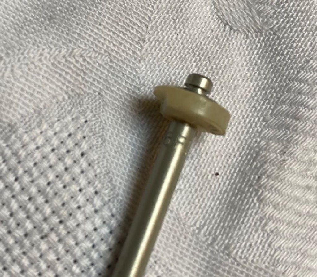 Die Kunststoffscheibe auf der Nadel ist verschlissen, eine neue hat den Absatz nicht, ausserdem (man siehst aber nicht so richtig) fehlt die Metallscheibe zwischen Clip und Kunststoffscheibe.