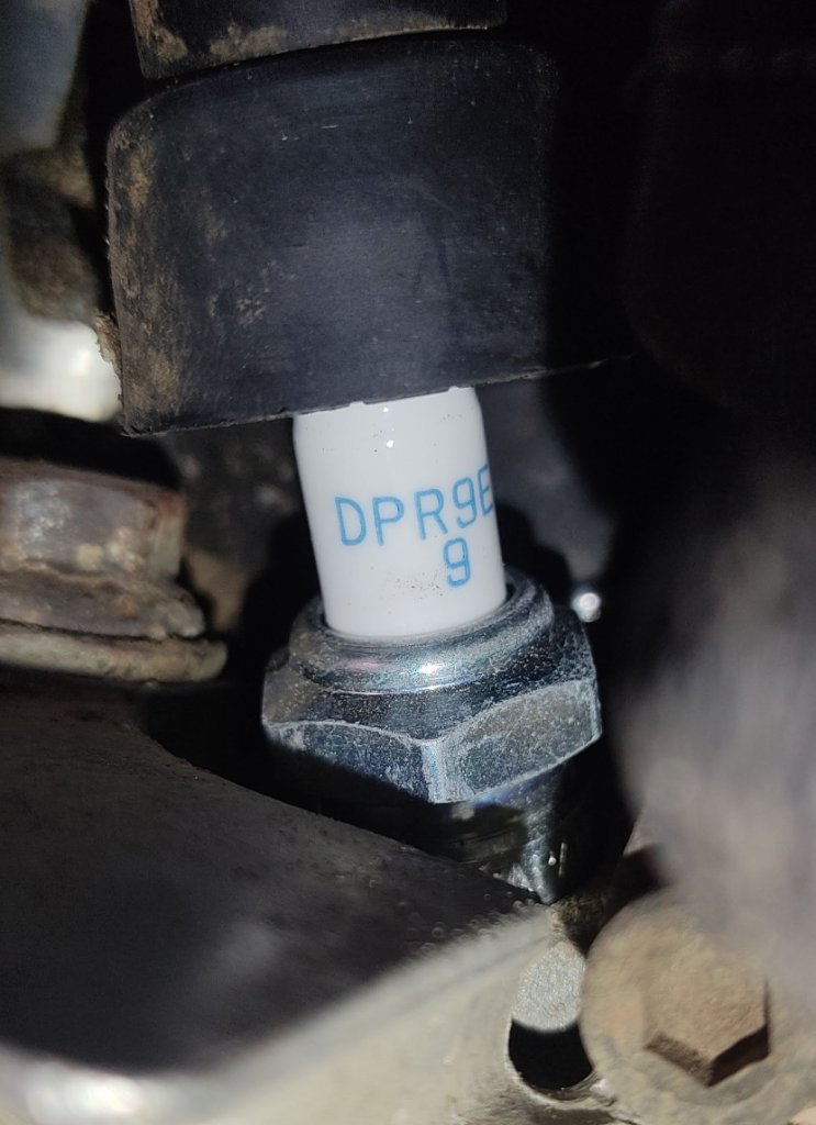 Die Kerze sieht aus, als ob sie gar nicht ganz eingeschraubt wäre (richtig lose war sie aber nicht) und es ist eine DPR8EA-9 statt der DPR9EA-9, die eigentlich rein soll.