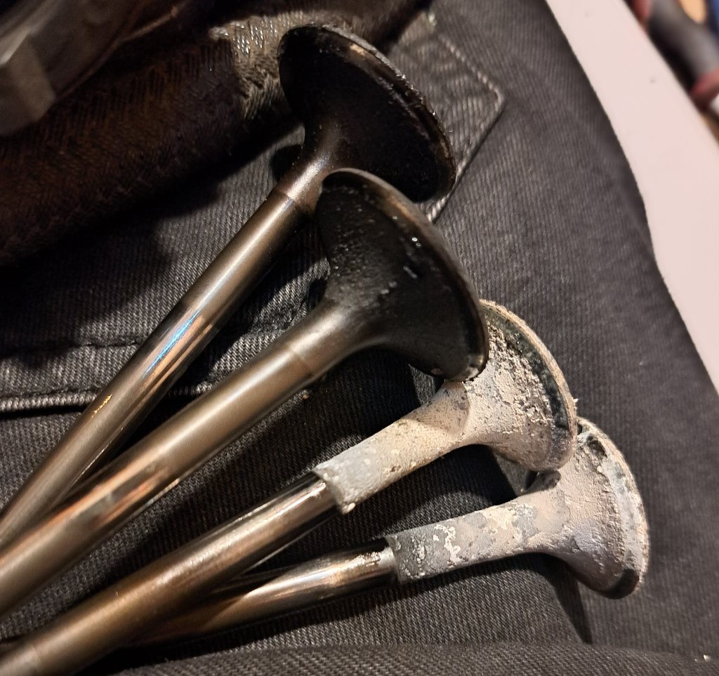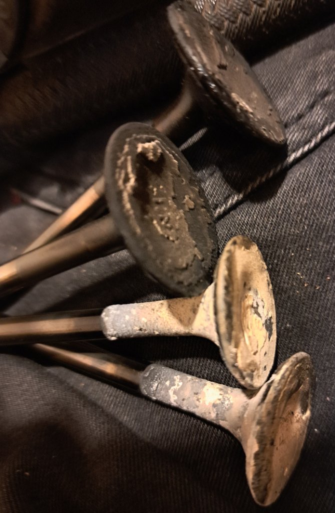 Die Ventile würd ich aufbereiten und nachschleifen lassen, zumal Ersatz nicht mehr leicht zu kriegen ist. Kipphebel und Nockenwelle habens aber hinter sich. Dafür schaun die Gleitlagerflächen im Kopf aber noch super aus.