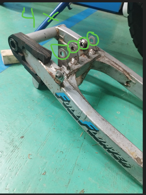 Schlitten für "Bremsscheibenaufnahme/anker" fehlt ( rot rechts ) und der 2 Punkt zum anschrauben des Kettenschutzes fehlt ( rot links)
