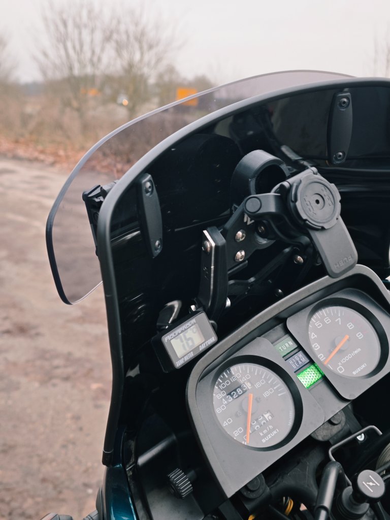 3D Druck in Kombination mit lasergeschnittenem Edelstahl. Die Teile greifen am Träger für Scheinwerfer und Tacho an und haben eine mehrfach verstellbare Aufnahme und Montagepunkte für zusätzliche Instrumente links und rechts. Eine Position links habe ich für die Öltemperatur genutzt.