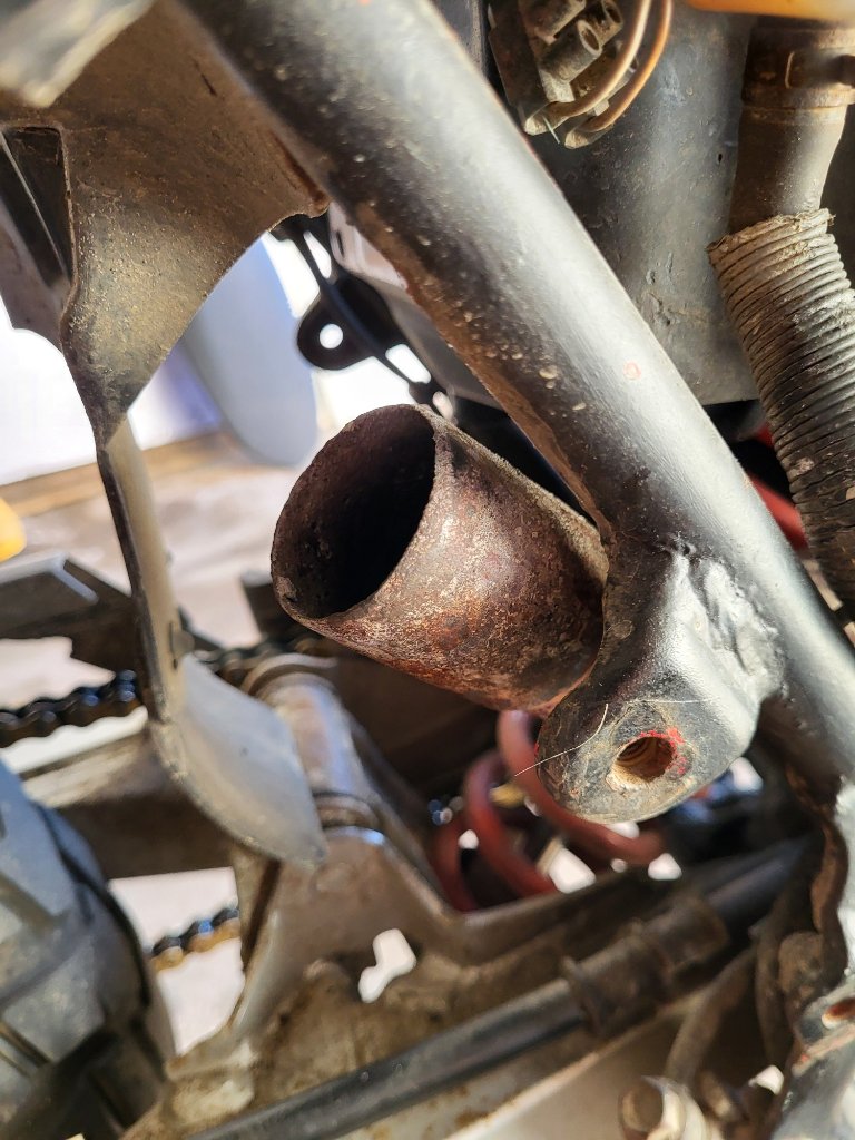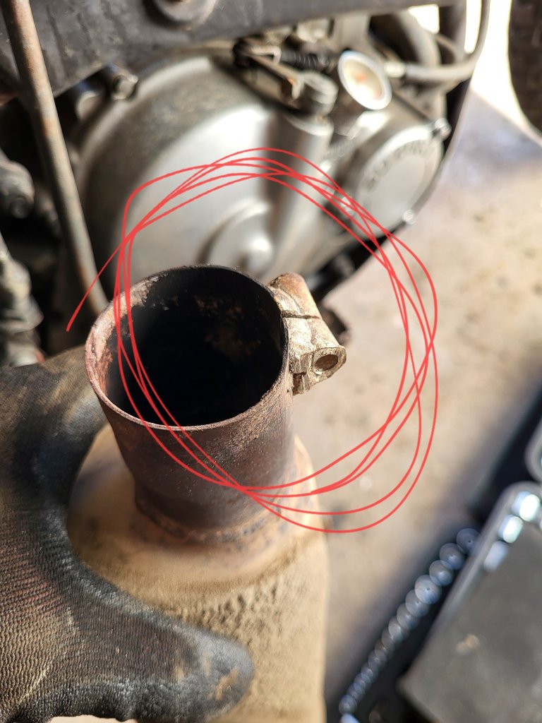 Reicht es, wenn ich den Auspuff wieder auf den Krümmer setze und mit einer passenden Schraube an der vorgesehenen Stelle (im Bild markiert) "festziehen" oder gehört da eigentlich noch was zwischen Auspuff und Krümmer ?