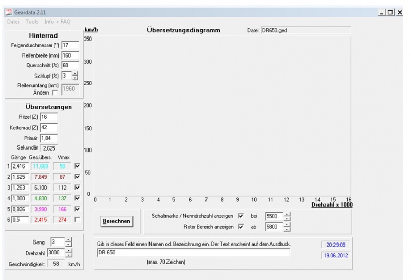Als Beispiel meine DR mit Sumo Bereifung mit Original Übersetzung 16/42 berechnet.