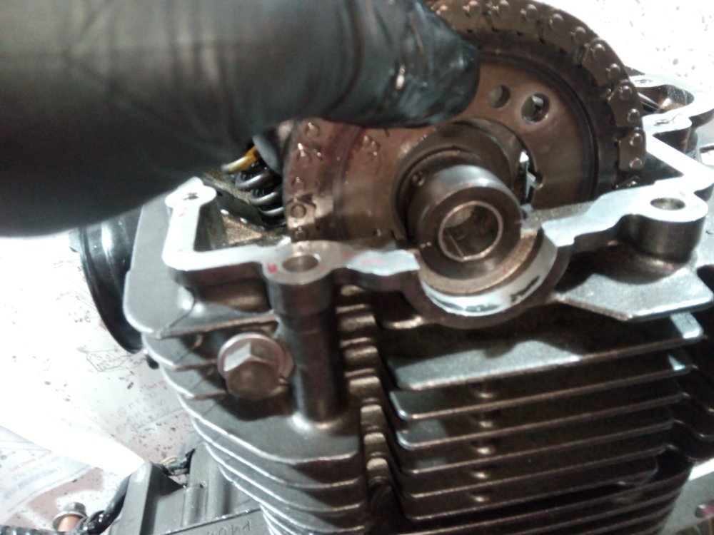 - dann die Nockenwelle in die Nockenwellenlagerung gelegt, Zahnrad und Kette hängen noch lose über der Welle
