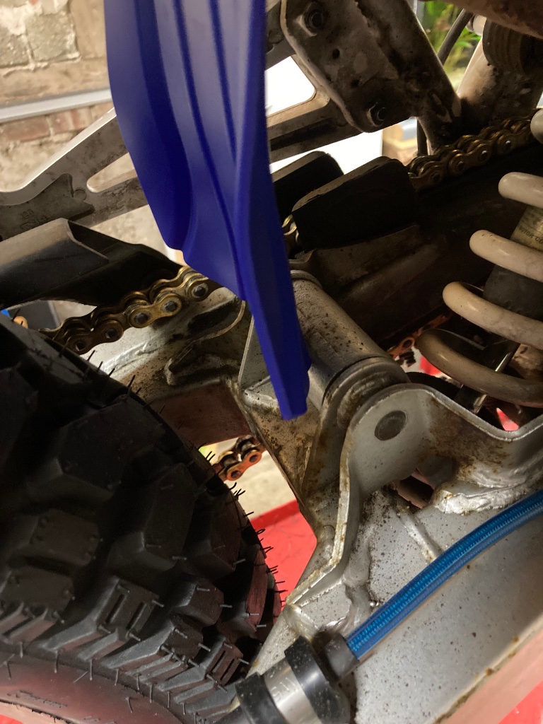 Hier habe ich mir das System der Tenere 700 angeschaut und abgekupfert, verbaut habe ich ein Acerbis Teil , welches eigentlich für die Montage unter die Umlenkung von unten gedacht ist. Das Material ist sehr steif und widerstandsfähig. Auf den Bildern seht Ihr wie ich das gelöst habe: Ich brauchte Abstand zur Umlenkung bzw. Schwinge und so kamen mir zwei Gummilager aus dem Fundus gerade recht. Der Schmutzabweiser ist jetzt beweglich aber steif genug montiert, damit alles schön selbst bei vollem Einfedern an der Schwinge vorbeigleitet. Klar wird er sich mit der Zeit abnutzen aber er ist erschwinglich und läuft dann halt als Wartungspunkt.