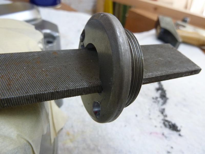 1. Variante versucht mit einem Stirnlochschlüssel einer Flex mit dem Ergebnis, dass ich mit dem Bohrer durchgestoßen bin (nunmehr Späne im Öl)