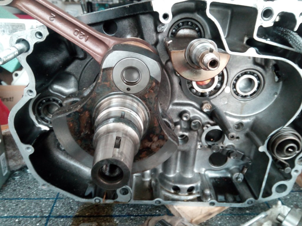 Ich habe mir deshalb nochmal mein altes KW-Lager, links angeguckt: ...dabei festgestellt, dass seitlich am Innenring ebenfalls Schleifspuren zu sehen sind...jedoch ohne das mir beim Renovieren des Motors in irgendeiner Form Verschleiß am Kettenrad aufgefallen wäre...aber auf den Fotos der KW sind am Lagersitz ebenfalls Schleifspuren zu sehen: