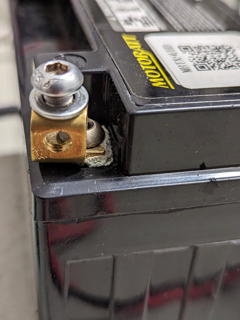 Nachdem die letzte Motobatt in meiner SP46 immer nach kürzester Zeit entladen war und ans Lagegerät musste, drückt es bei der aktuellen Motobatt nun die Säure an den Polen raus.