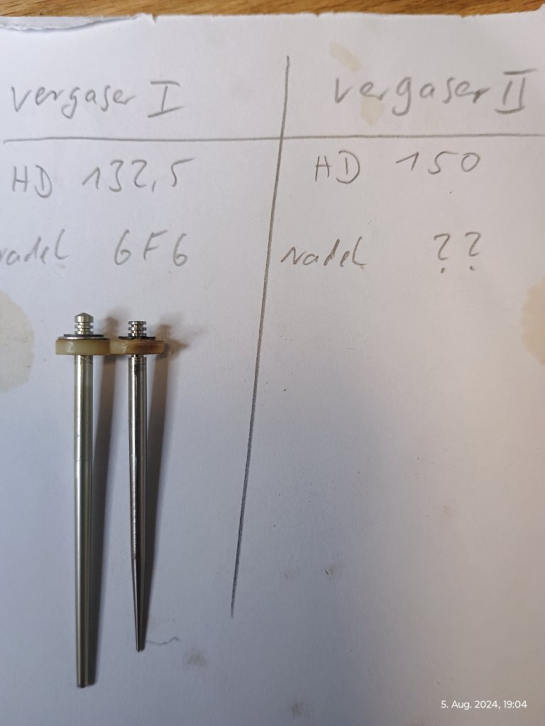 Die Nadel vom Vergaser 2 hat keine Bezeichnung, ist kürzer und hat auch eine völlig andere Formgebung. Die rechte Nadel gehört zum Vergaser 2, also zu meinem der eingebaut ist