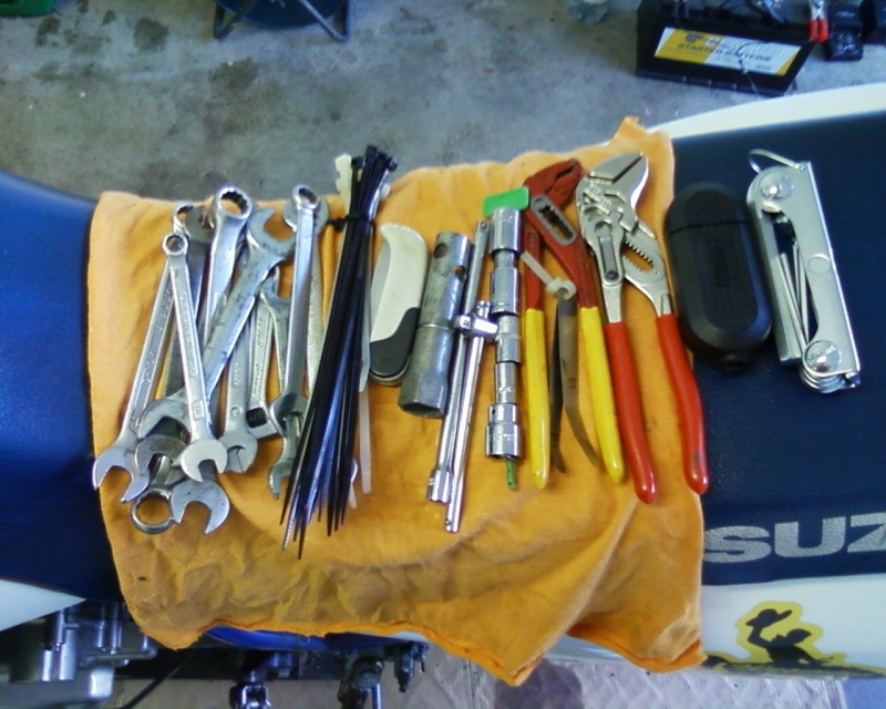 Ein paar Maulschlüssel (8-14mm),Kabelbinder, Messer,Zündkerzenschhlüssel,Nüsse (8,12,13,14mm) mit T-Griff und Verlängerung, 2 Zangen (die eine von Knippex,bei der die Schenckel immer gleich zueinander stehen),