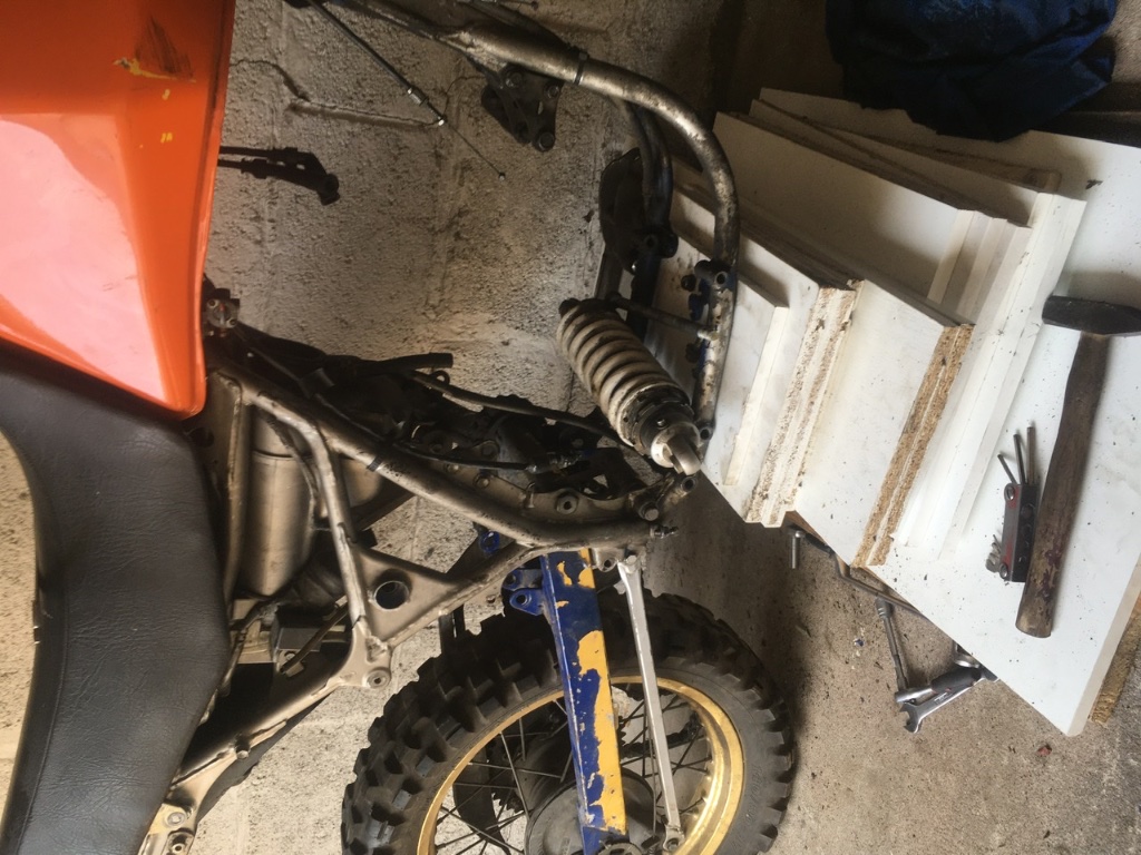 die dakar wurde ihres federbeins beraubt. kein akt, man unterlegt das mopped mit "was auch immer", löst die schrauben von umlenkgestänge & federbein, zieht das gestänge einzeln raus und dann das federbein. werde dieses überprüfen und in meine blaue bauen.