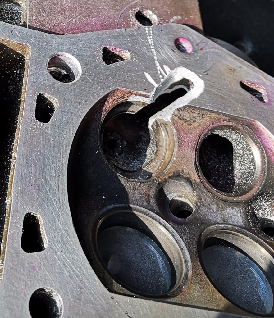 Der Riss ist jetzt vollständig ausgefräst, er ging durch den Öl-Kühlkanal bis tief in den Auslasskanal.