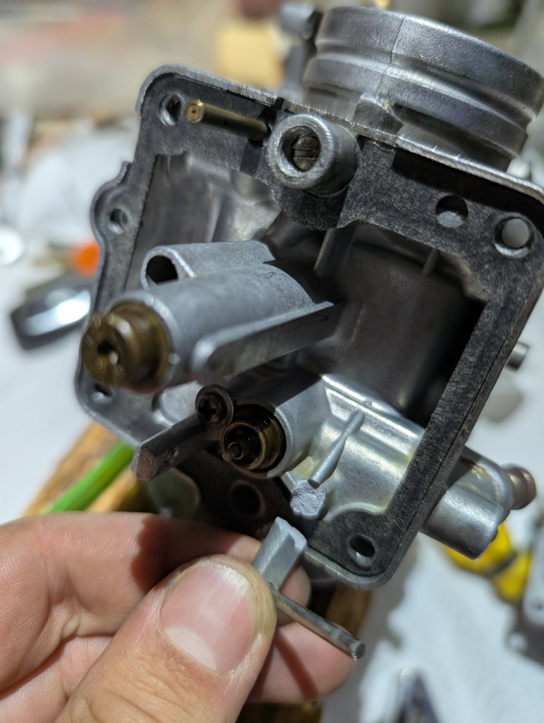 Dann ist mir noch aufgefallen, dass bei der Schwimmernadel der kleine Bügel gefehlt hat, welcher sie wieder herauszieht. Ich musste also versuchen den Pin herauszubringen. Habe versucht vorsichtig zu hämmern, bis der Stift sich löst, leider ohne Erfolg. Irgendwann ist der Aluminiumsteg am Schwimmergehäuse gebrochen. Ich habe ihn dann mit neuem Schwimmernadelsatz trotzdem wieder zusammengebaut und das Moped ist recht ordentlich gelaufen. Das obwohl der O-Ring bei der Düse der Beschleunigerpumpe fehlte und das wohl kein Idealzustand ist.