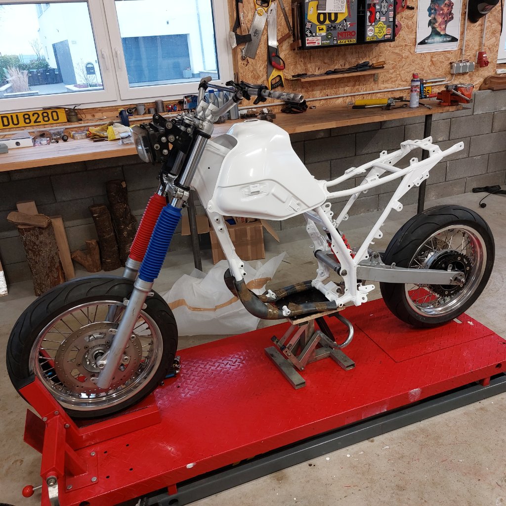 Der Rahmen wurd gestrahlt und gepulvert. Der Tank auch. Beides in RAL 9016 Glanz