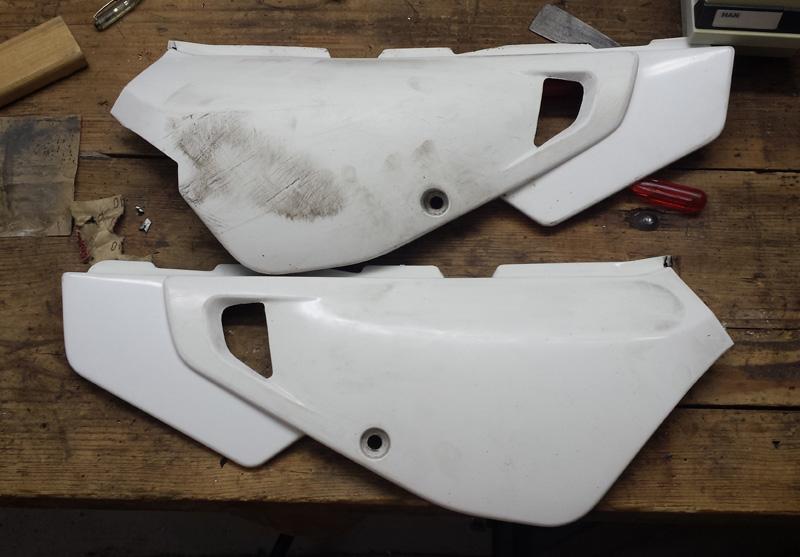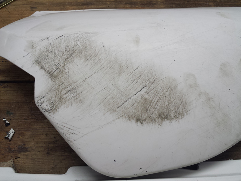 Danach sah man dann auch schon den ersten Grund warum überhaupt lackiert wurde. Die Verkleidung hat ein paar Kampfspuren die nach Straßenkontakt aussehen. Die Fußraste ist auch ziemlich abgerieben.