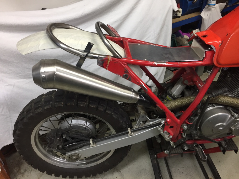 Alles zusammen sieht das jetzt ungefähr so aus. Dazu habe ich den Tank im Tunnel etwas anpassen lassen, ein Zwischenstück für die Verbindung Krümmer/Endtopf anfertigen lassen u.v.a.m.