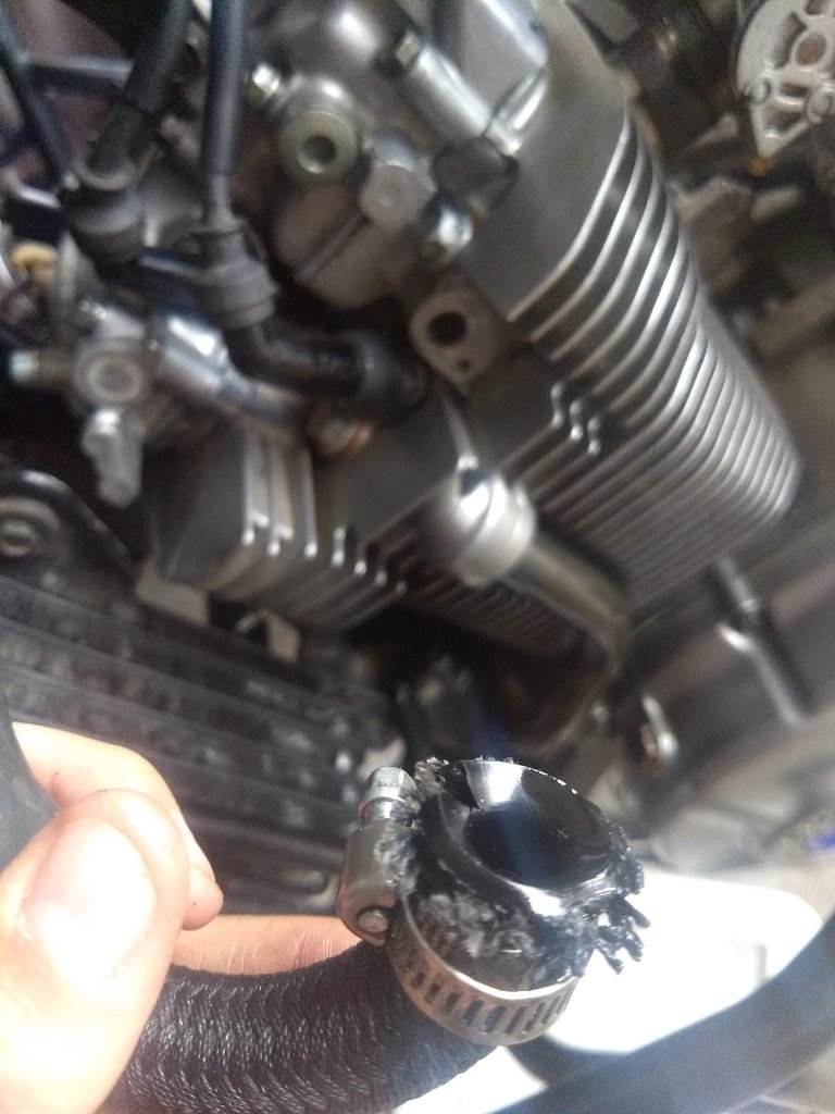 Nachdem ich sie für einige Stunden im Straßenverkehr bewegt habe und sie in die Garage stellte, ist mir das aufgefallen (siehe Bild). Nun dachte ich, dass die Dichtringe meiner Ölleitung versagt hätten, deswegen habe ich diese durch neue ersetzt und die Ölleitung wieder draufgesetzt. Kurze Runde gedreht - leider verliert Sie immer noch ein wenig Öl. Fahrtechnisch kann man nichts bemängeln, sie läuft nicht unruhig oder dergleichen, nimmt das Gas gut an und bremst, wenn sie soll. Anspringen tut sie gut.