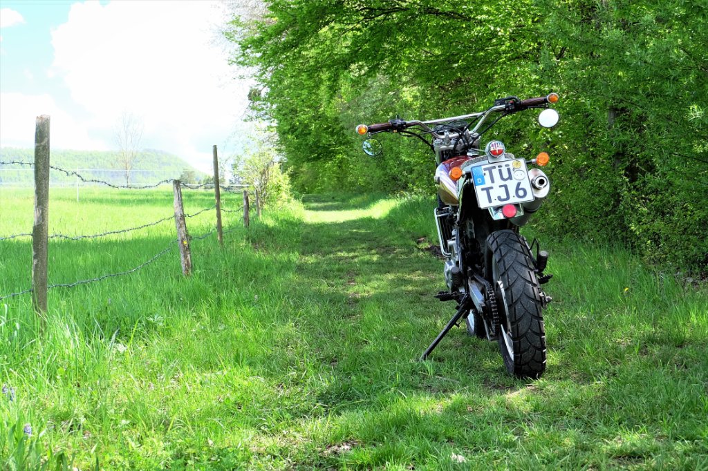 Außen sah der super aus, und ich dachte, den Rost innen bekomm ich mit Zitronensäure in Griff. Aber nach dem Entrosten war außer der schönen Lackhülle nicht mehr allzuviel übrig. Das Benzin lief aus vielen winzig kleinen Löchern, und ich musste mich leider nach Ersatz umsehen. Da kein vernünftiger 360er-Tank zu finden war, hab ich jetzt den 400er. Der passt auch, wenn man den Lenkeinschlag etwas begrenzt