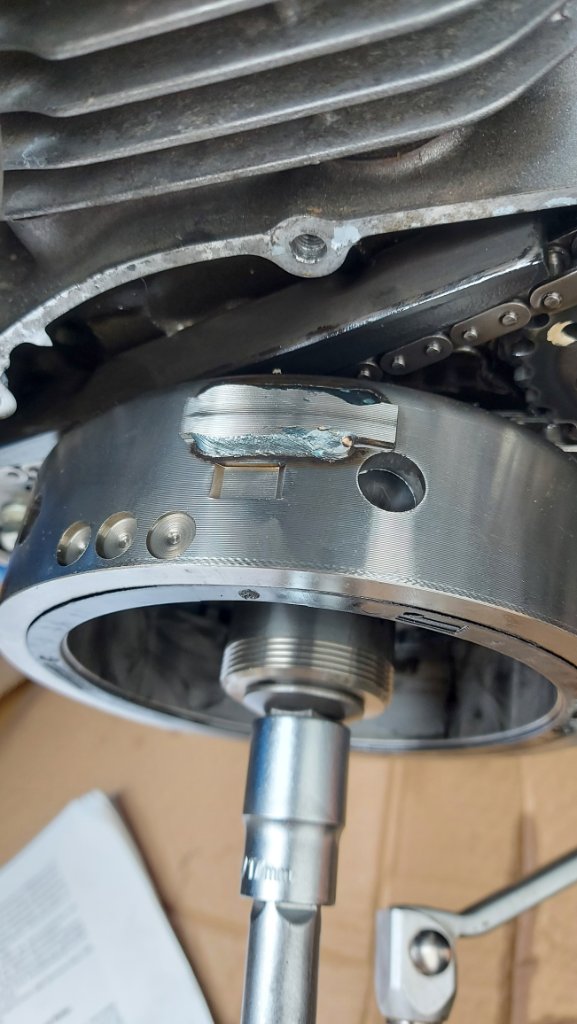 Heute habe ich mir zum ersten Mal die 6000er Wartung vorgenommen und bin neben diversen kaputten Schrauben, Gewinden und unerklärlichen Splittern im Ölsieb auf Verwirrung bei der Ausrichtung des Polrades zum Spannen der AGW-Kette gestoßen. Die im Büchli erwähnte Markierung auf dem Vorsprung des Polrades gibt es bei mir nämlich nicht und außerdem sieht dieser ziemlich komisch abgenutzt aus.