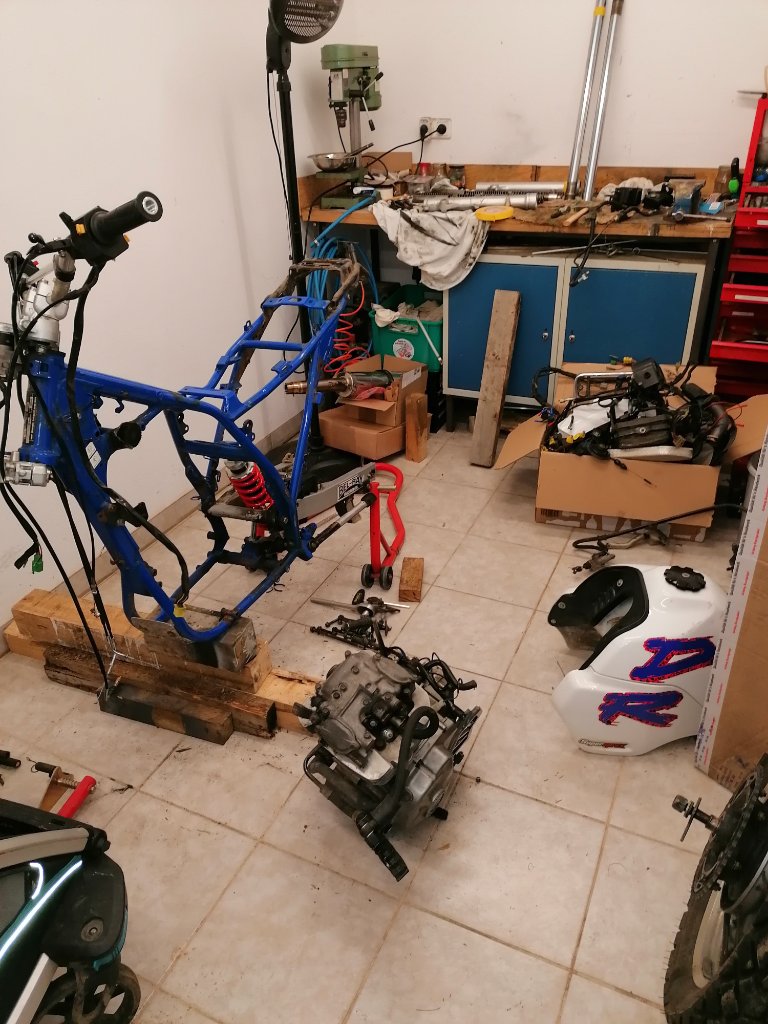 Geplant ist erstmal den Rahmen und Schwinge pulvern zu lassen. Federbein ist bereits neu. Gabel bekommt nach dem pulvern auch ein Service. Die Teile liegen schon bereit und die Gabel ist zerlegt.