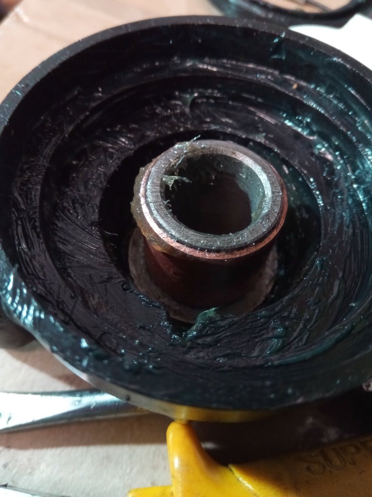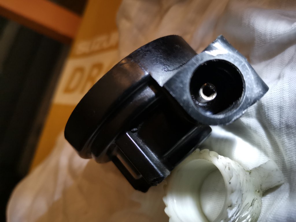 Am Gehäuse ist ein Stückchen abgeplatzt, das sollte aber nichts ausmachen. Bekommt man die Metallschnecke irgendwie aus dem Gehäuse raus, also zerstörungsfrei? Dort wo die Welle eingesteckt wird, ist eine Bezeichnung drauf und es könnte ein Simmering sein, muss aber nicht. Im WHB ist hierüber nichts beschrieben. Will da nicht mit Gewalt rangehen.