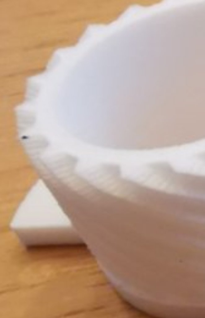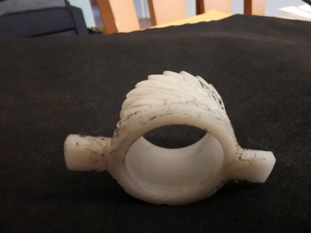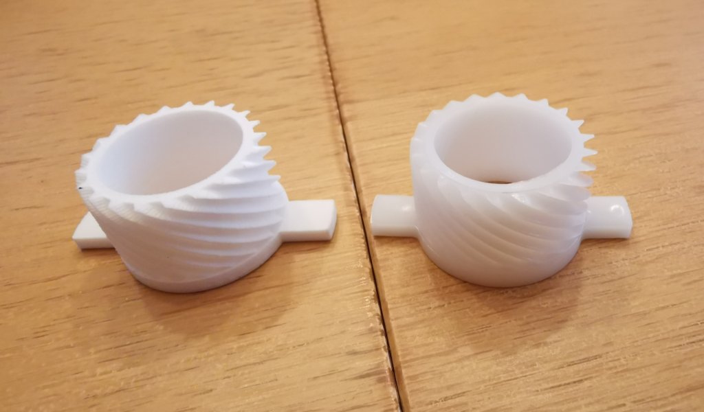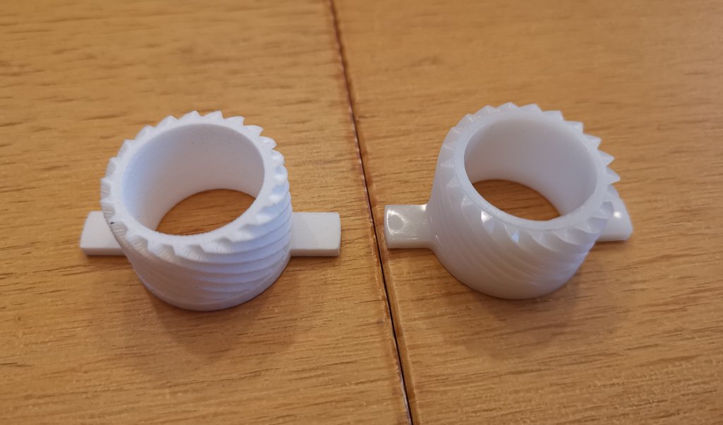 Wenn nun eine Schräge geformt werden soll, also wie bei diesem Zahnrad, dann erkennt man einen leichten Versatz zwischen den Schichten, da das Filament meist eine Mindeststärke hat, bzw. die Düse, durch die es gedrückt wird.