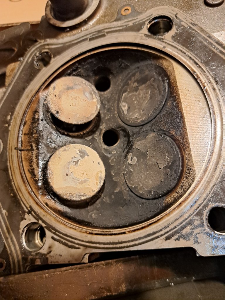 Ich bin nicht eurer Meinung. Der Zylinder hat Rostringe, d.H. er wurde mal feucht abgestellt. Diese Rostringe kriegst Du mit Schleifpapier nicht egalisiert, und da geht das Öl dran vorbei. Der Kolben hingegen sieht noch gut aus, die Ringe haben allerdings schon ganz schön was hinter sich. ICH würde das nächste Übermaß nehmen. Und falls ein Kolben nicht erhältlich ist, eine neue bzw bessere Zylinderlaufbuchse suchen, und sie mit neuen Ringen verbauen. Wenn Dir das zu viel Aufwand ist, kannst Du ja mal die Schleifpapiermethode probieren, und auf alle Fälle neue Schaftdichtungen verbauen. Wenns dumm läuft, musst Du den Motor halt irgendwann nochmal zerlegen.