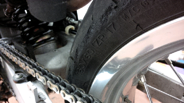 Zwischen Kette und Reifen sind oben und unten ca. 7mm Luft. Ich vermute dass die Kette unten im Leertrum ihr Unwesen treibt und am Reifen frisst. Mir fällt da nur noch ein einen schmaleren 150er drauf zu machen und hoffe dass der TüV damit keine Probleme macht.
