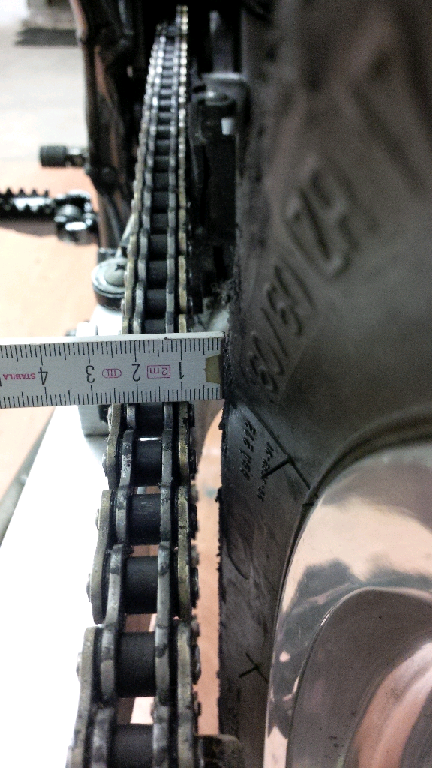 Die Kettenspannung ist gemäß WHB richtig eingestellt, ich glaube 30mm Spiel wenn sie auf dem Seitenständer steht. Die beiden Kettenspanner Excenter sind gleich auf beiden Seiten. Ob das Rad trotzdem schief drin ist oder die Felge falsch eingespeicht wurde müsste ich irgendwie noch prüfen.